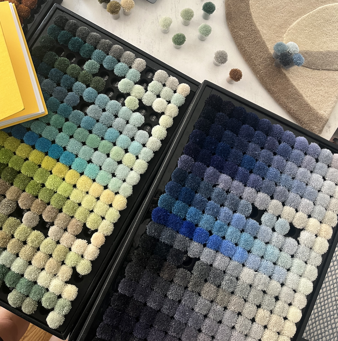 We work with the ARS 1200 Wool color chart, so picking the perfect colorway for your room is easy. Send me an email we can work out the best way to select colors for you. We will also provide a rendering of your selected colorways.